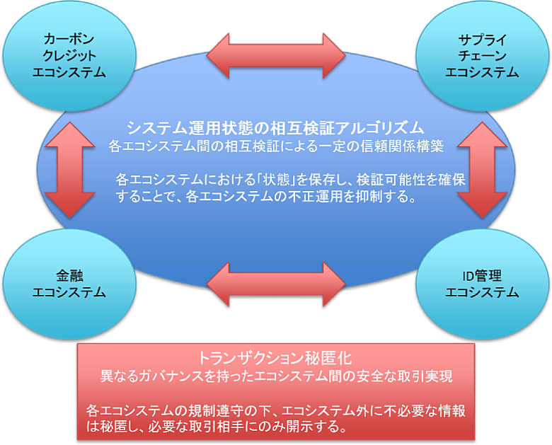 システム運用状態の相互検証アルゴリズムは、各エコシステムのある時点の「状態」を、軽量かつ効率的に、分散して記録する技術です。エコシステムの状態を記録することで、あとからその状態を確認・検証することができます。完全に信頼できない相手のシステムを信頼するための重要な要素です。