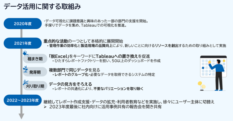 そして同社は、Tableauの利用者拡大とさらなるデータ活用推進のために、NTTデータが支援した人材育成の仕組み「スキルベルト制度設計」の取り組みを開始した。