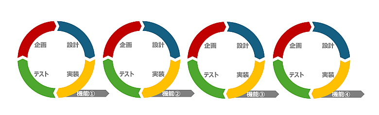 アジャイル開発とは、ソフトウェア開発の一つで、スプリントと呼ばれる短期的な反復開発サイクル(1週間~1ヶ月)を繰り返し進めていく手法です。短期間でお客さまを含めたシステムレビューを行うことで、実装された機能ごとの良し悪しをシステム上で確認することが可能です。