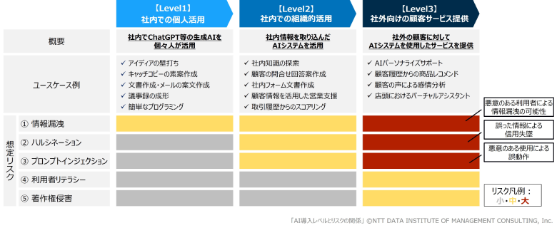 これらのリスクの影響範囲と深刻度は、AIの利用用途や展開レベルによって増大します。個人の業務補助的な利用から、社内システムとしての組織的活用、さらに顧客向けサービスとしての提供へとレベルが進むにつれて、事故発生時の影響は大きくなり、求められる統制も高度化します。下図1は、AI活用レベル別にリスク要因とリスク量を整理したものです。レベルが上がるにつれてリスク(小・中・大)も増すことから、AI活用の深度に応じた適切なリスク対策が不可欠です。