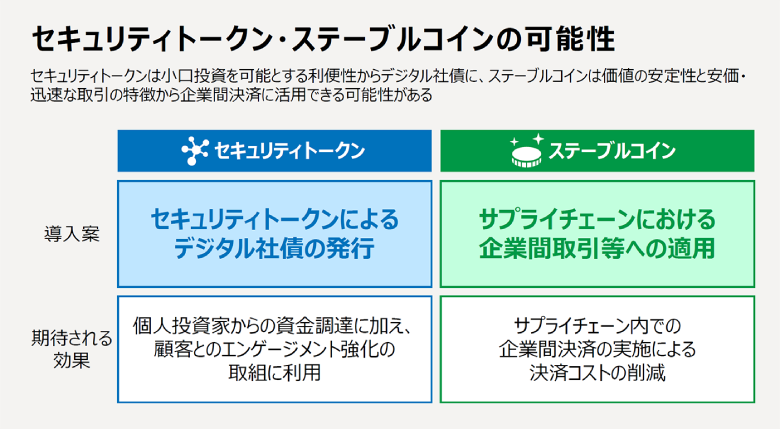 このような変革期において、事業会社が注目する新たな仕組みが「セキュリティトークン」と「ステーブルコイン」である。セキュリティトークンは、ブロックチェーン技術により移転可能な有価証券として機能し、ステーブルコインは、同じくブロックチェーン技術を活用した決済手段として、法定通貨との価値連動を特徴とする。