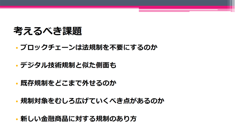 こうした状況を踏まえ、既存の金融規制の見直しや規制対象の拡大を含めた新たな規制体系の策定が重要な課題となっている。