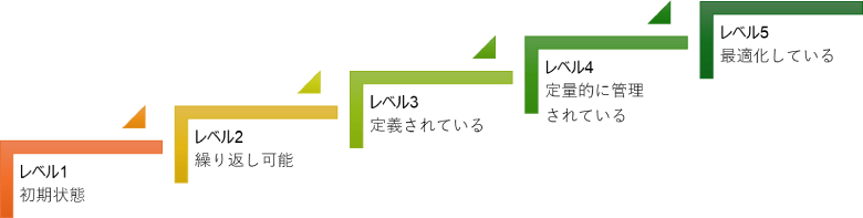 成熟度のレベルとしては、例えば、プロセスの成熟度モデルとして有名なCMMI(※1)においては以下のような段階に分けられています。