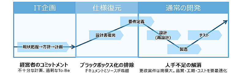 仕様復元は、ブラックボックス化を解消する工程です。長年増改築されたシステムは、設計書がメンテナンスされていなかったり、そもそも設計書がなかったりするため、開発者が仕様を理解できずシステムの構築が進みません。
