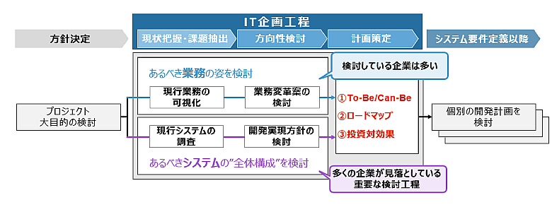 まずIT企画は、大規模な更改を実施する場合の業務の可視化、システム方針、今後の計画立案を行う非常に重要な工程です。この工程で失敗すると、見積もりや目標設定の誤りを招き、結果として経営層の十分な理解や継続的なコミットメントが得られないリスクがあります。
