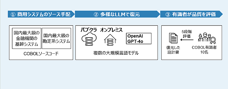 この課題に対し、NTT DATAはパブリッククラウド、オンプレミス環境の両方で複数の大規模言語モデル(LLM)を駆使して、COBOLソースコードから設計書を自動復元する技術を確立しました。復元された設計書は、COBOLの有識者によってモデルごとに精度評価され、さらに生成AI自身による評価も導入することで、復元精度の向上と品質保証を両立しています。