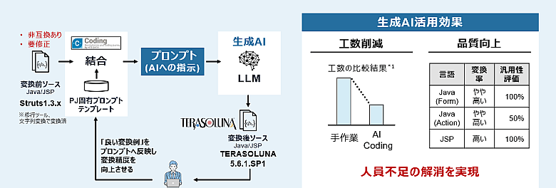 この課題に対し、NTT DATAは独自のコード生成・変換アセット「Coding by NTT DATA」(※3)を活用。PoC(概念実証)を繰り返しながら変換精度を高め、StrutsからSpringへのコード変換を自動化することで、大幅な工数削減を実現しました。