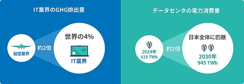 これまでは排出量が多い業界として製造業の取組みが先行してきましたが、最近では特にAIの急速なニーズ拡大もあり、IT業界からの排出量に注目が集まっています。世界のデータセンターの年間電力消費は2030年には2024年から倍増し、日本全体での電力消費を上回る量になると予想されています(※2)。IT業界のGHG排出は電力消費に起因するものだけでなく、データセンターの建造やその内部のサーバー類、ユーザー端末、ネットワーク機器などの製造/廃棄の過程で排出されるものも無視できません。IT業界が排出するGHGは世界全体の4%を占めるとも言われています(※3)。