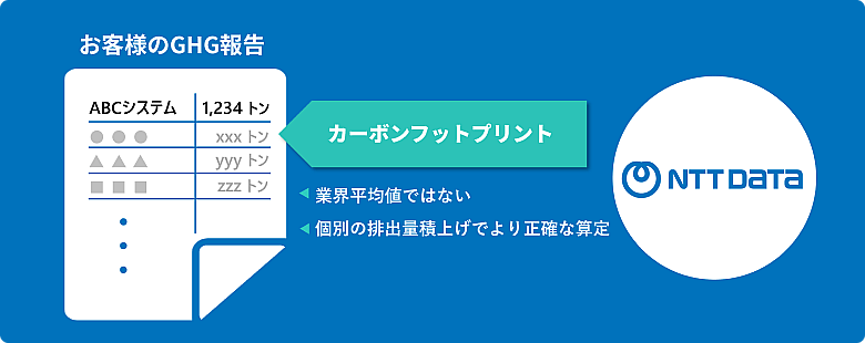 NTT DATAでは、意図に賛同してご協力いただけるお客様を中心に上述の「ソフトウェアに関するカーボンフットプリントの製品別算定ルール」に準拠した形で排出量情報を提供する取組みを始めています。お客様は業界平均値ではなく実際の排出量情報を得ることで、削減努力を開示排出量に反映することが可能となり、また将来の削減に向けた具体的なアクションを描けるようになります。