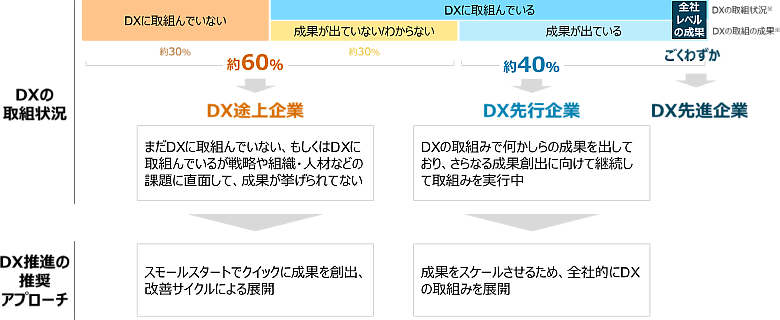 デジタル活用による企業変革を実現することは、避けられない経営課題と言えますが、取るべきアクションは現在の取り組み状況に応じて異なります。これからDXの取り組みを本格化するDX途上企業においては、まずスモールスタートでクイックに成果を創出し、改善サイクルを回しながら展開することをお勧めしています。具体的な取り組みは以下の記事でご紹介していますので、合わせてご参照ください。