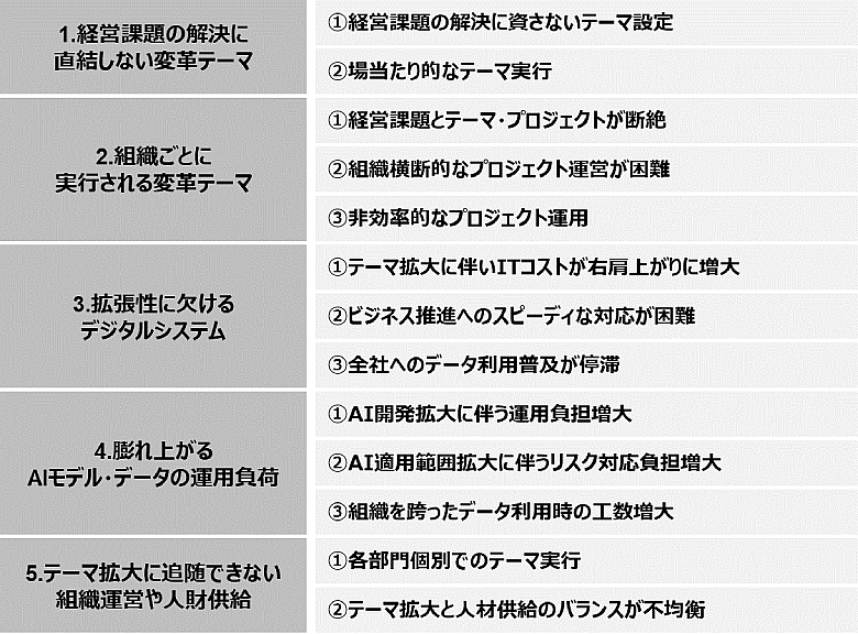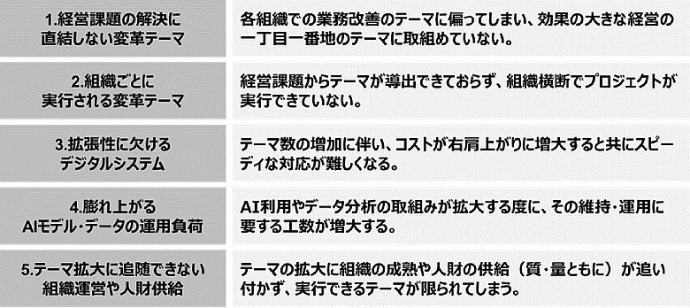 DX先行企業が成果をスケールさせ、全社レベルの成果創出を目指す際に乗り越えるべき壁は、以下の5つに当てはまることが多いと考えます。それぞれの壁について、具体例を交えてご説明します。
