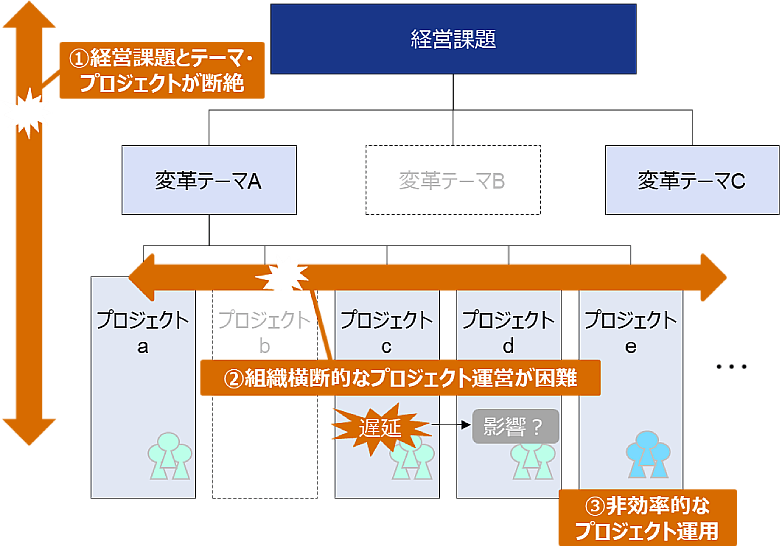 2つ目の壁は、経営課題からテーマが導出できておらず、組織横断で変革テーマやプロジェクトを実行できていないことです。経営課題の解決に必要なテーマやプロジェクトを漏れなく落としこめておらず、①経営課題とテーマやプロジェクトが断絶しているため、個々のプロジェクトが成功しても経営的に期待した成果を上げられない状態となっていることがあります。また、テーマ・プロジェクトを体系的に整理できていないと、ステークホルダを巻き込んだ②組織横断的なプロジェクト運営が困難なため、あるプロジェクトで発生した問題が他のプロジェクトに波及したり、対応が後手となる場合もあります。さらに、各組織が個別独自にプロジェクトを実行・管理しているため、組織間でノウハウが共有されずに、③非効率なプロジェクト運用になっている問題もあげられます。