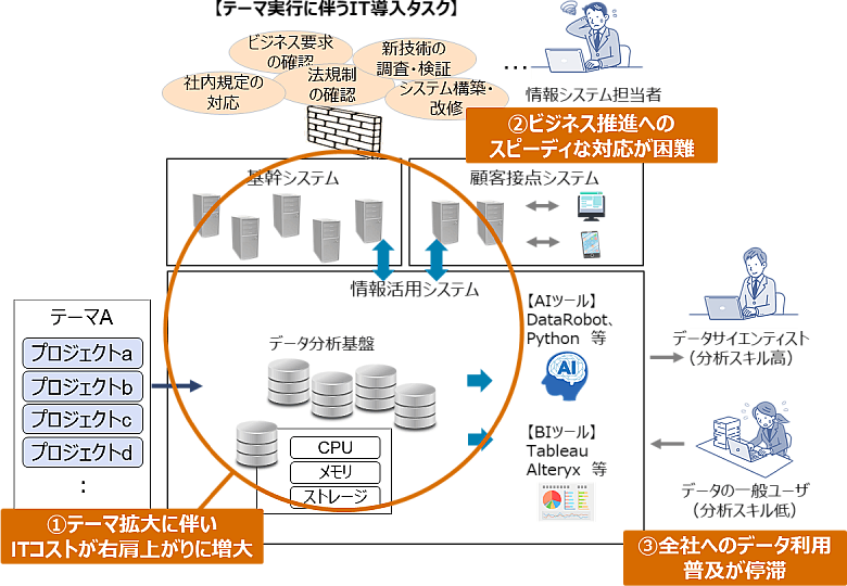 3つ目の壁は、テーマ数の増加に伴い、デジタルシステムのコスト増大と共に、スピーディーな対応が難しくなることです。特にボトムアップでDXの取り組みを進めてきた企業では施策や組織ごとにIT環境を構築していることが多く、①テーマ拡大に伴いITコストが右肩上がりに増大し、投資対効果が出しづらくなっています。テーマ実行に新技術の活用や顧客接点対応が必要な場合、ITガバナンス対応やシステム改修に時間を要し、②ビジネス推進へのスピーディーな対応が困難なケースも多く存在します。また、成果スケールには一般ユーザーの活用拡大も重要ですが、環境整備が不十分だと③全社へのデータ利用普及が停滞してしまいます。