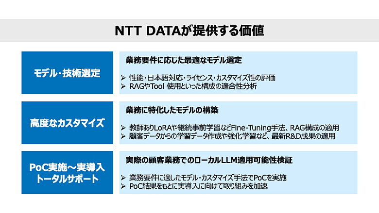NTT DATAでは、ローカル生成AIモデルの活用に向けて、モデル選定にとどまらず、「モデル調査・技術検証・業務適合性の評価」から「実業務向けのカスタマイズ」「導入支援」まで一貫した価値提供を行っています。