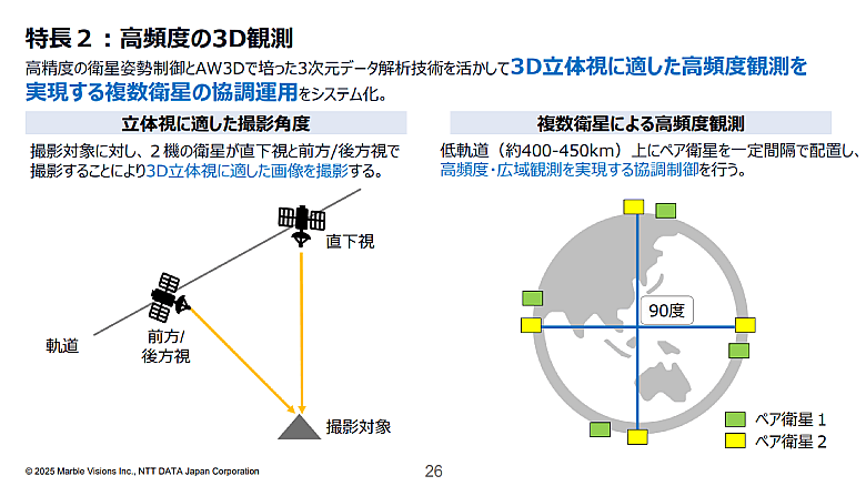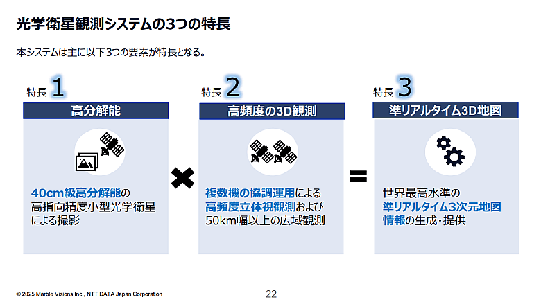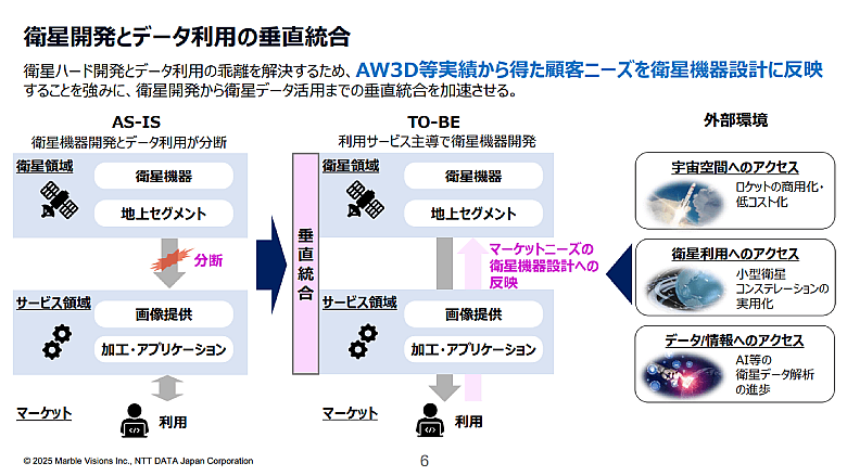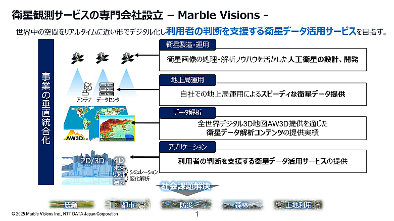 宇宙分野は、衛星の技術革新やデジタルツイン分野のニーズ拡大などにより、民間主導での成長が見込まれている。その成長を見据えて、NTTデータは2024年7月に『Marble Visions』を設立した。観測衛星を自ら開発・運営し、より高頻度かつ高精度な撮影が可能な観測衛星システムを整備。撮影した衛星画像を元にしたデータ解析を行い、最終的には利用者の判断を支援する地理空間情報サービスまでワンストップで提供する。