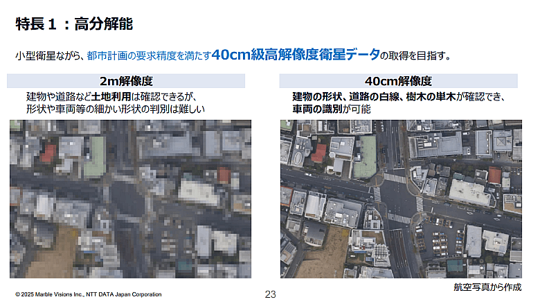 「地図には情報レベルがあり、我々の生活を支える基盤となる道路地図や建物地図は、地図情報レベル2500、つまり1/2500の縮尺で作られています。この縮尺の地図は40センチ級の画像をベースにすることが多く、現在は航空測量で行っています。しかし、光学衛星観測システムが実用化されることで、地図整備コストがネックとなっている自治体での公共地図の更新や、道路・住宅地図などの民間の地理空間情報の更新頻度の向上へ活用が期待されます」(筒井)