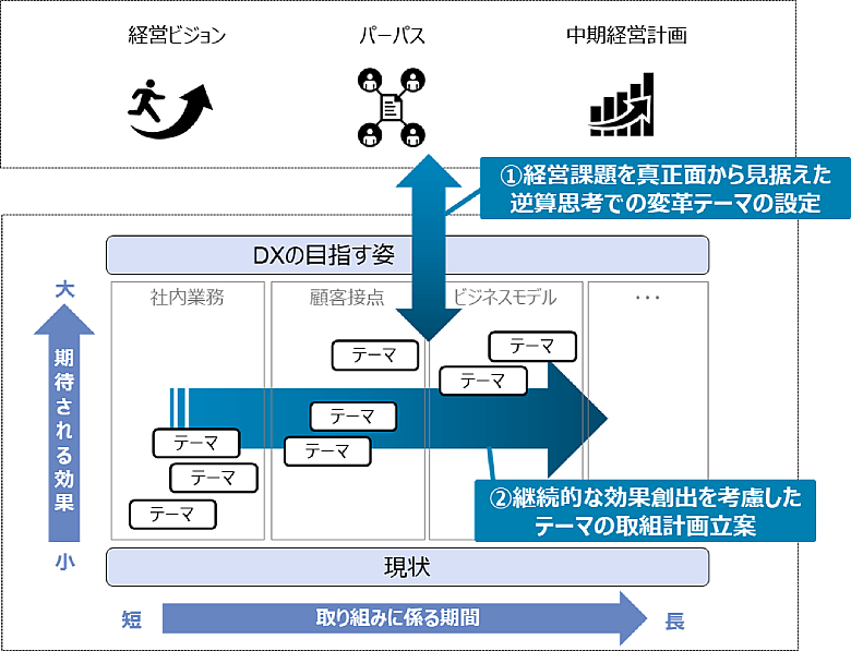 まず、経営課題の解決に直結する変革テーマを策定し、成果創出に向けたテーマ実行の道筋を明確化することが重要です。自社の経営方針を踏まえ、企業の収益・成長(新規ビジネス立ち上げ・売上向上など)といった①経営課題を真正面から見据えた変革テーマを逆算思考で設定します。ボトムアップ思考に陥らないように、中期経営計画などを踏まえた高い目標としてDXの目指す姿を設定し、その目標から逆算して取り組むべきテーマに落とし込んでいくことがポイントです。