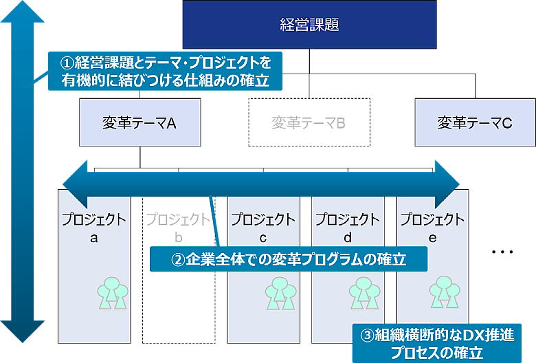 また、変革テーマの実現には、②企業全体での変革プログラムを確立し、体系的にプロジェクトを定義して、それらを有機的・効果的に実行することが肝要です。プロジェクト間をまたいだ統合的なマネジメント(プログラムマネジメント)を推進して、ステークホルダを適宜、関与させていく必要があります。
