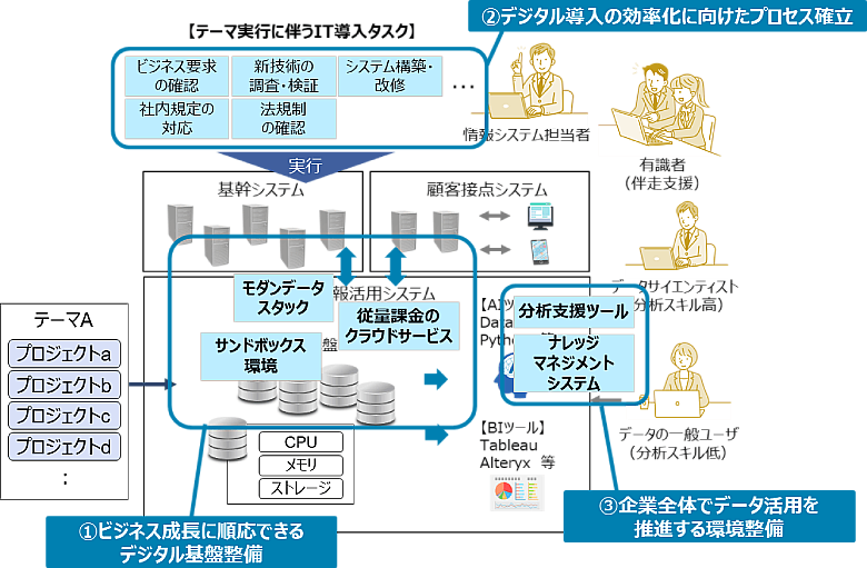 さらに、ユーザー拡大の観点では、GUIベースの支援ツールやナレッジ共有の仕組みなどを具備したデータ分析環境など、③企業全体でデータ活用を推進する環境整備を図ることで、分析テーマ数やデータ利用部門の増加に柔軟に対応すると共に、一般ユーザーのデータ活用促進を実現できます。