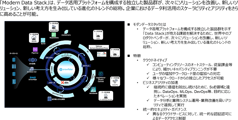 モダンデータスタックなどクラウドネイティブなソリューションを採用したアーキテクチャを構築することで、会社全体でのIT環境の整合性を維持しつつ、ビジネス成長とコストを連動させるとともに、アジリティや拡張性を兼備した①ビジネス成長に順応できるデジタル基盤を整備することをお勧めしています。