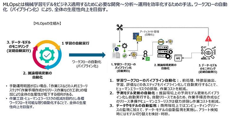 ①AIモデル管理機能の導入(MLOps)により、AIモデルの維持運用に関するワークフローを自動化することで、生産性の向上、維持コストを抑止できます。