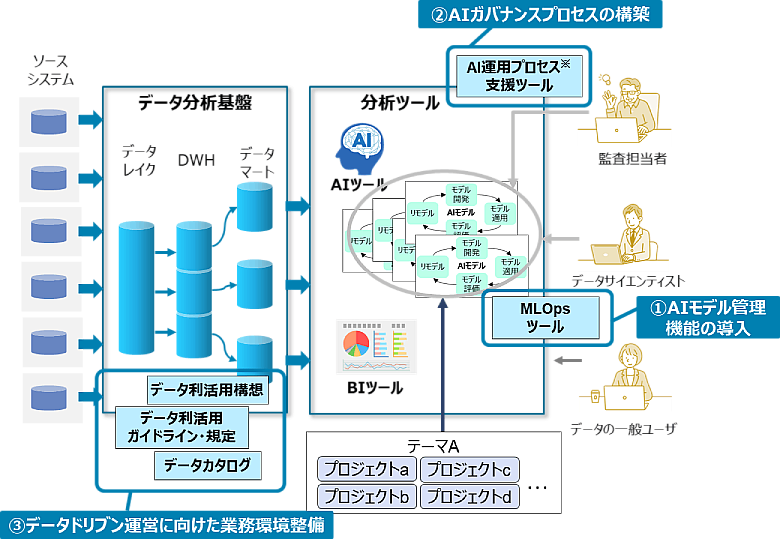 さらに、組織横断での効率的なデータ利用に向けては、全社的なデータ利用の構想策定やデータ管理態勢など③データドリブン運営に向けた業務環境整備も求められます。