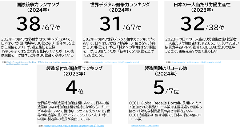 実際、日本の製造業の現在地を見てみると、国際競争力ランキング、世界デジタル競争力ランキング、労働生産性など、グローバル市場において停滞している現状が浮き彫りになっています」(西)