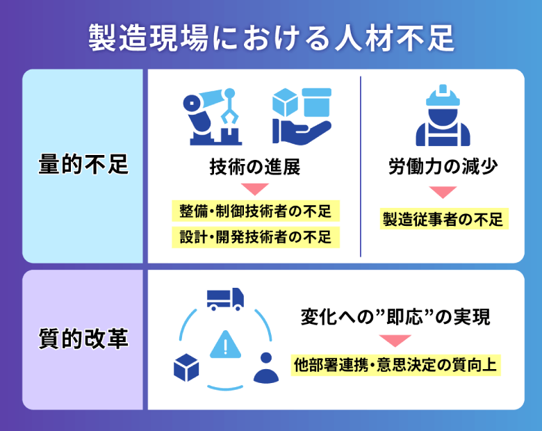 「不足している人材の内訳をみると、『機械化・自動化』『少量多品種化』『設計開発技術の高度化』といった“技術の進展に対応する”技術者が最も不足しており、次いで、『製造従事者』という“労働力の減少に対応する”技術者も量的に不足している状況です。一方、他部署との連携や意思決定を担う『製造技術者(開発を除く)』は量的には充足しているものの、変化への“即応”を実現する質的改革が急務となっています」(工藤)