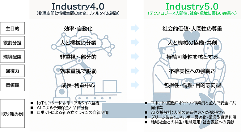 人材不足、変化への対応という課題を乗り越える上で、近年注目を集めているのがIndustry5.0というコンセプトだ。Industry5.0が提唱されることとなった経緯と、Industry4.0からの進化のポイントについて、西は次のように解説する。