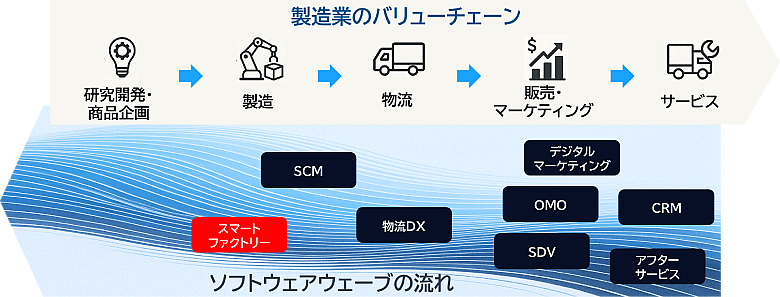 製造業のバリューチェーンには、研究開発・商品企画→製造→物流→販売・マーケティング→サービスという一連の流れがあります。このバリューチェーンにおいて、ソフトウエアウェーブはサービスや販売・マーケティングといった下流から上流に向かって広がってきており、ようやく『スマートファクトリー』など製造領域でのソフトウエア活用が始まりつつあります」(西)