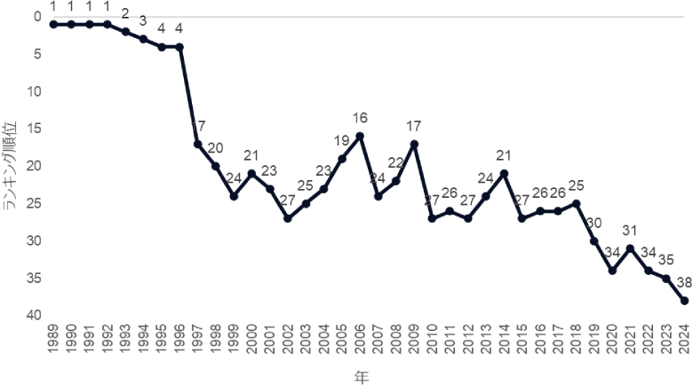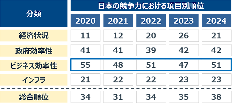 近年、日本の国際競争力は低下しており、IMD(国際経営開発研究所:International Institute for management Development)の世界競争力ランキングでは、ランキング発表が開始された1989年時点における日本の競争力は世界1位だったものの、2024年現在では世界38位となっています。(図1)。項目別順位をみると、特に「ビジネス効率性」が日本の総合的な競争力順位の低さの要因です(表1)。