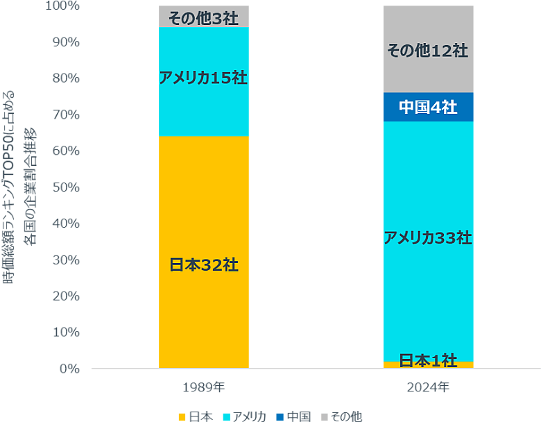 各国の経済を担う企業の競争力に着目し、企業の時価総額ランキングTOP50に占める企業数の推移をみると、日本企業は1989年から2024年にかけて、32社(うち12社は製造業)から1社と減少しています。かつては製造業を中心に日本企業の競争力は高い水準にあったものの、近年においてはその国際競争力は低下していると言わざるを得ません(図2)。日本が国全体として国際競争力を取り戻すためには、各日本企業が国際競争力を取り戻すことが必要不可欠です。