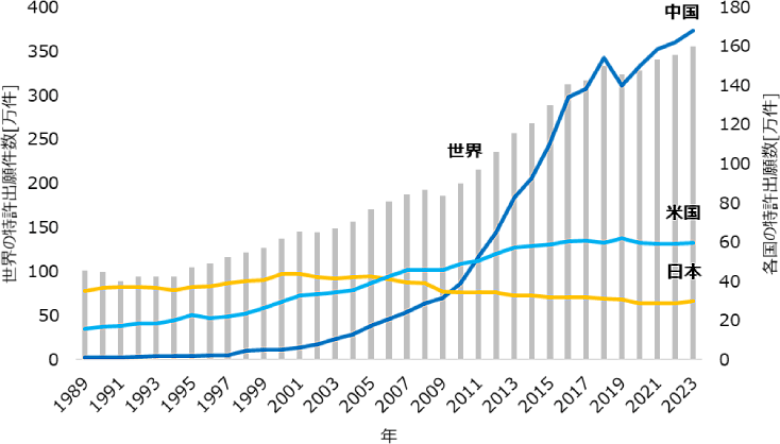 図3:世界の特許出願数TOP3米国、中国、日本の特許出願件数の推移