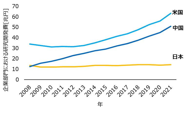 図4:アメリカ、中国、日本における企業部門の研究開発費の推移