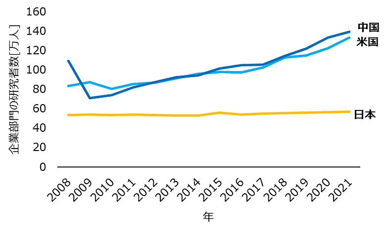図5:アメリカ、中国、日本における企業部門の研究者数の推移