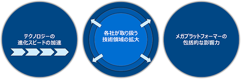 近年、技術を取り巻く環境は大きく変化しています。ここでは、技術の進化のスピード、各社が取り扱う技術領域、メガプラットフォーマーの影響について考察します。