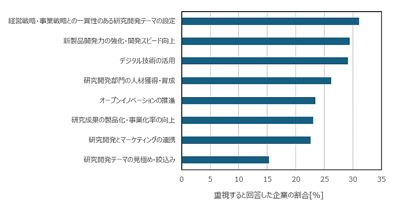 - 経営戦略・事業戦略との一貫性のある研究・開発テーマの設定や、研究開発テーマの見極めといった「研究開発戦略策定に関する課題」