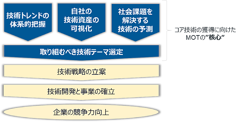 技術を取り巻く環境が大きく変化していく中で、日本企業が国際的な競争力を得るためには、技術と経営を橋渡しし、両者を統合的にマネジメントする視座が不可欠であり、まさにその役割を果たすのが、MOT(Management of Technology/技術経営)です。技術と経営をつなぐMOTの機能の核心は、企業価値の創出のために必要となる技術を選定し、獲得・維持するための戦略を立案・実行することで、経営方針に沿った技術開発を推進することにあります。