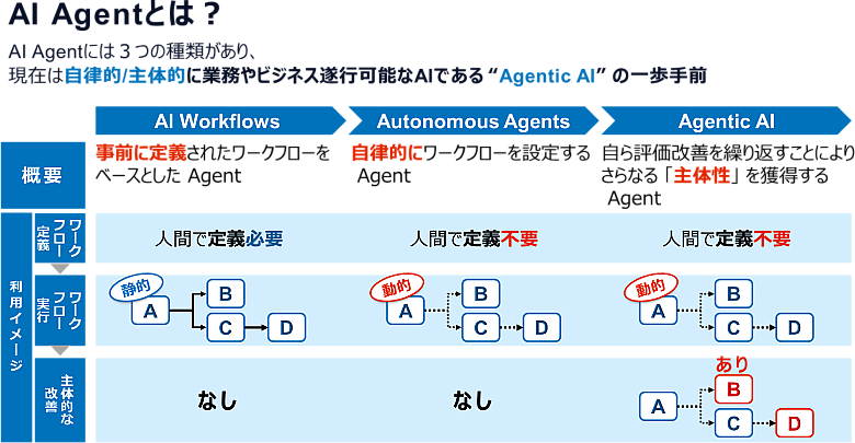 “事前に定義”されたワークフローをLLM(Large Language Model:大規模言語モデル)がさまざまな情報を参照しながら自動的に実行するものです。例えば、「請求処理」の業務であれば、請求書の確認→データ入力→承認依頼といった一連の流れを、人間の指示なしに完了できます。定型的な業務であれば、人間によりデータを定義し、実行を自動化するAI Workflowsは業務プロセスの改善に有効なAIエージェントです。