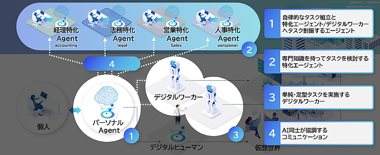 私たちはパーソナルエージェントがマルチエージェント技術を介してデジタルワーカーや特化エージェントと連携し、ユーザーのリクエストを解釈して業務を自律的に実行していく世界を目指しています。パーソナルエージェントが自律的なタスクを組み立て、専門知識を持った特化エージェントがタスクを検討し、デジタルワーカーが単純・定型タスクを実行する——まさにチームワークを生成AIが再現していくと考えています。