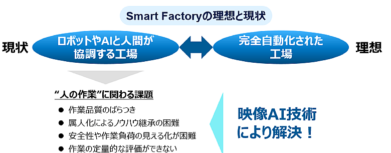 完全自動化された工場である「スマートファクトリー」は製造業の理想ですが、現状は柔軟な判断や繊細な作業などの自動化は難しく、依然として人が重要な役割を担っています。人が介在する作業は、属人化しやすく、作業品質の均一化、ノウハウ継承、安全性の見える化、作業の定量的な評価等の実現において、今なお多くの課題が残されています。
