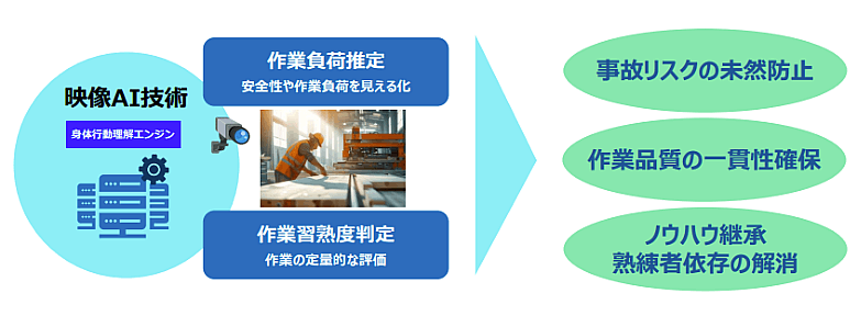これらの課題に対し、NTT DATAは映像AI技術を用いた解決を目指しています。映像AIにより、製造現場における人による作業の見えづらい情報を定量的に把握することで、事故防止など安全性の向上、作業品質の一貫性確保、ノウハウ継承の実現等が期待されます。