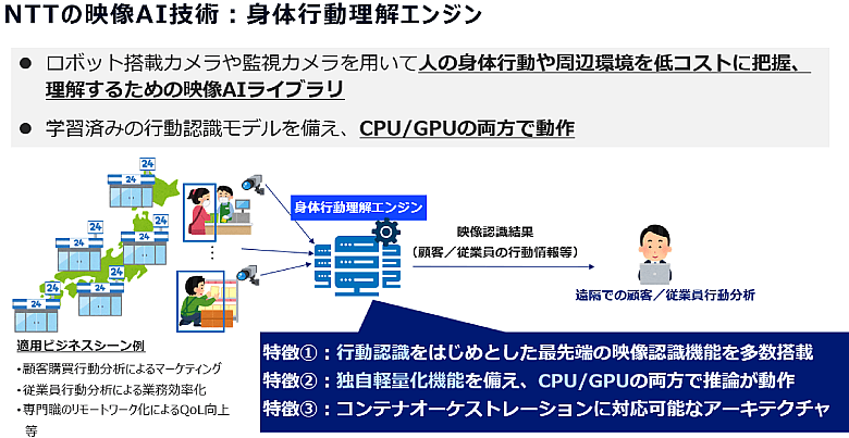 上記のような映像AIを実現する技術として、NTT人間情報研究所では、人物の行動を理解するための「身体行動理解技術」、および映像AIライブラリ「身体行動理解エンジン」の研究開発を進めています。