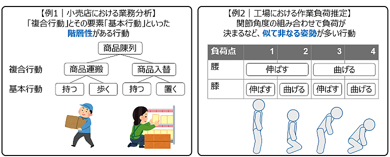 一般的な行動認識技術は、「歩く」「座る」など日常的な基本行動を対象とし、それらの分類・識別を実現することを主な目的としています。しかし実際の活用シーンでは、基本行動に含まれない、「階層性がある行動」や、「類似した行動」を認識することが求められ、その分類・識別の精度が課題となることがあります。