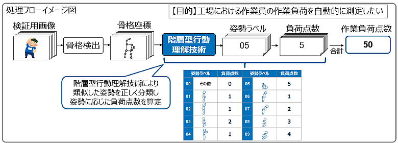 NTT DATAは製造業のお客さまとともに、工場作業員の負荷の推定に階層型行動理解技術を適用する検証を行いました。検証では、映像から抽出した骨格座標と動作ラベルで作業負荷を推定し、事前に定義した負荷量との一致度を評価し、「階層型行動理解技術」が作業負荷の正確な把握に有効であることを確認しました。