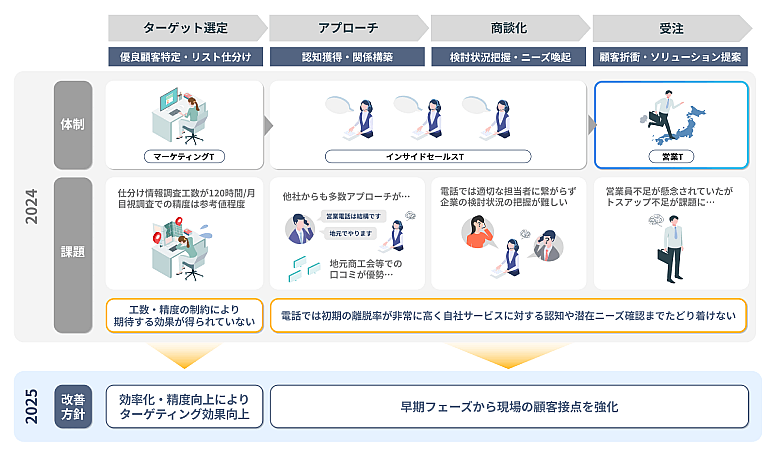 顧客の所在は全国各所にあります。成約の確率が高い顧客への対面営業に人的リソースを配分する戦略にかじを切っても、人的リソースが大幅に増やせるわけではありません。また、インサイドセールスの体制を縮小する方針としたものの、中長期的な成長や事業目標のためには、インサイドセールスで行ってきたアプローチ数の確保や継続接点の確保も依然として必要な状況でした。