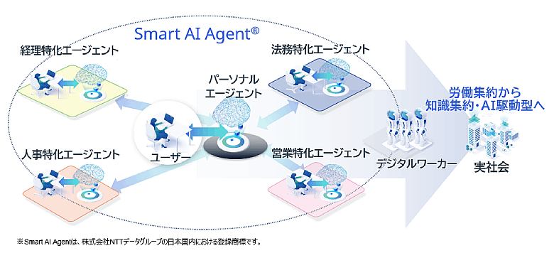 NTTデータは、このようなオフィスワーカーの生産性向上、付加価値業務へのシフトを推進するため、複数のAIエージェントが自律的に業務を実行するという生成AI活用コンセプト「Smart AI Agent®」を打ち出しています。