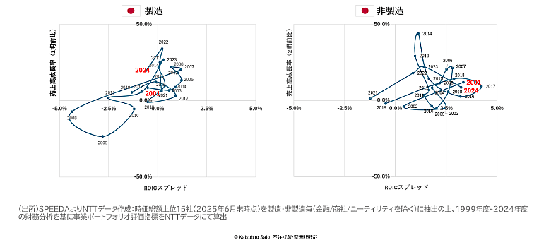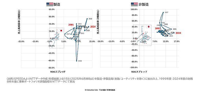 さらに佐藤教授の分析では、事業ポートフォリオ評価スコア(成長率×ROICの複合指標)で顕著な日米格差が明らかになった。日本企業が年度によってはマイナス圏に落ち込む一方、米国企業は数百という高水準を維持している。