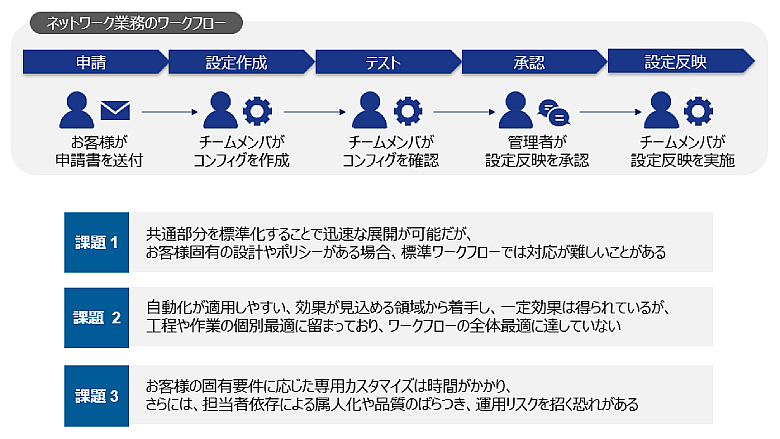 アジリティと適応性を実現するためには、どのような課題があるでしょうか。ネットワーク業務における典型的なワークフロー(申請→設定作成→テスト→承認→設定反映)および、実際の現場で発生しうる課題を整理しました。