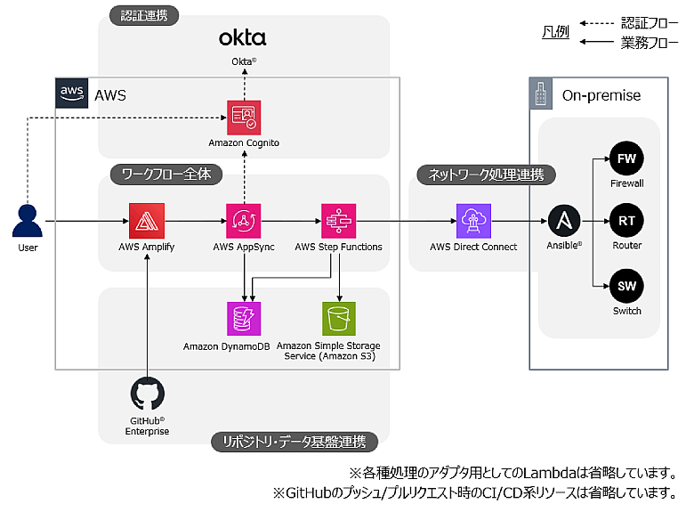 - 認証連携:複数プロジェクトが併行して進行する組織においては、一貫した認証と認可が不可欠です。そこでAmazon CognitoやOkta®を組み合わせ、強力な認証・認可機能を提供します。これにより、利用者は安全にワークフロー自動化基盤へアクセスでき、管理者は権限制御を比較的容易に行えます。結果として、セキュリティを確保しながらスピード感のある業務が可能になります。